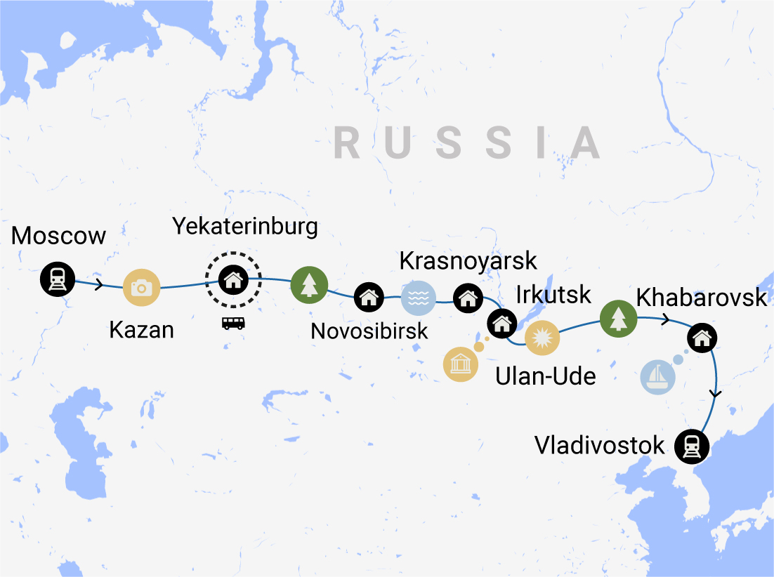 The route includes the following cities: Moscow – Kazan – Yekaterinburg – Novosibirsk – Krasnoyarsk – Irkutsk (Lake Baikal) – Ulan-Ude – Khabarovsk – Vladivostok.