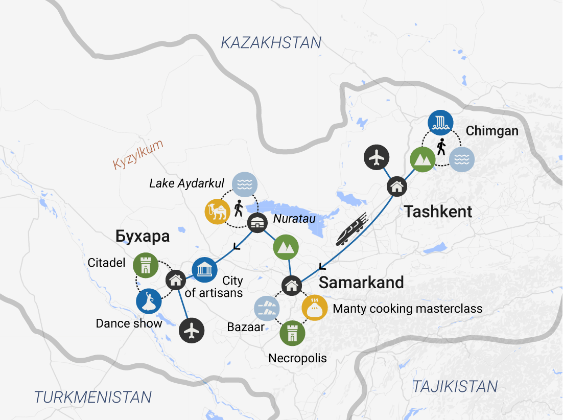 In 8 days we are going to explore Uzbekistan from different angles. Firstly, we’ll enjoy the unique nature of the country — we’ll spend time walking in the mountains, breathing fresh air, and relaxing on the shore of the lake. Secondly, we’ll travel through three magnificent cities, each of which has its own charm, and immerse ourselves in the history of ancient civilizations.