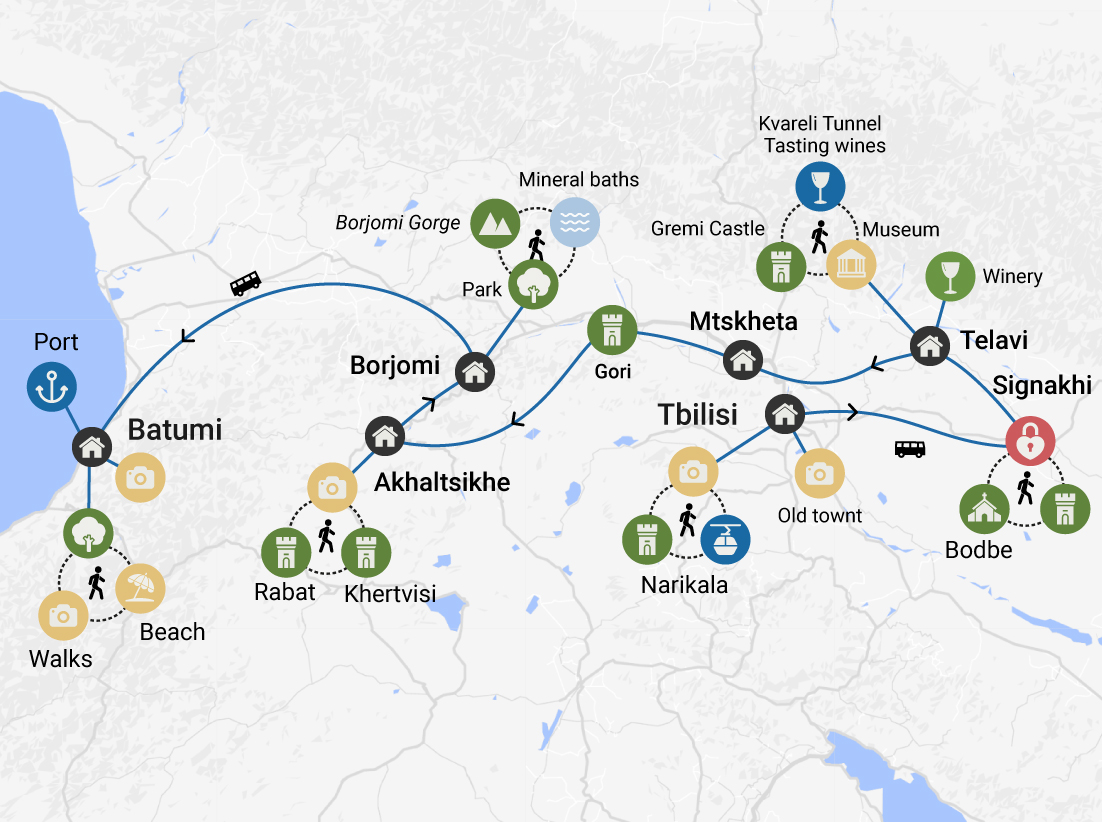 You can choose a return flight from Batumi departing after 15:00 on the last day of the tour or a night flight from Tbilisi departing after 22:00. You can get to Tbilisi by high-speed train or bus.