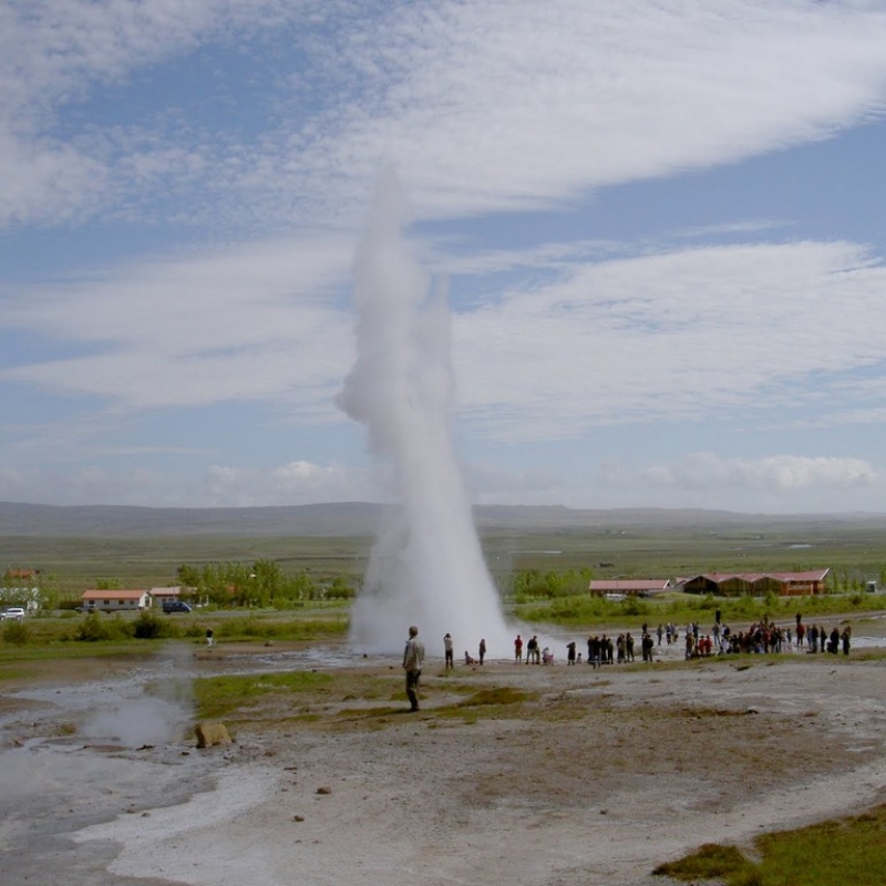 The next stop is the Great Geyser, which gave name to all the other hot springs in the world. Its eruption happens only once a day, but there is another hot spring Strokkur nearby, which erupts to a height of about 20 meters every 10 minutes.