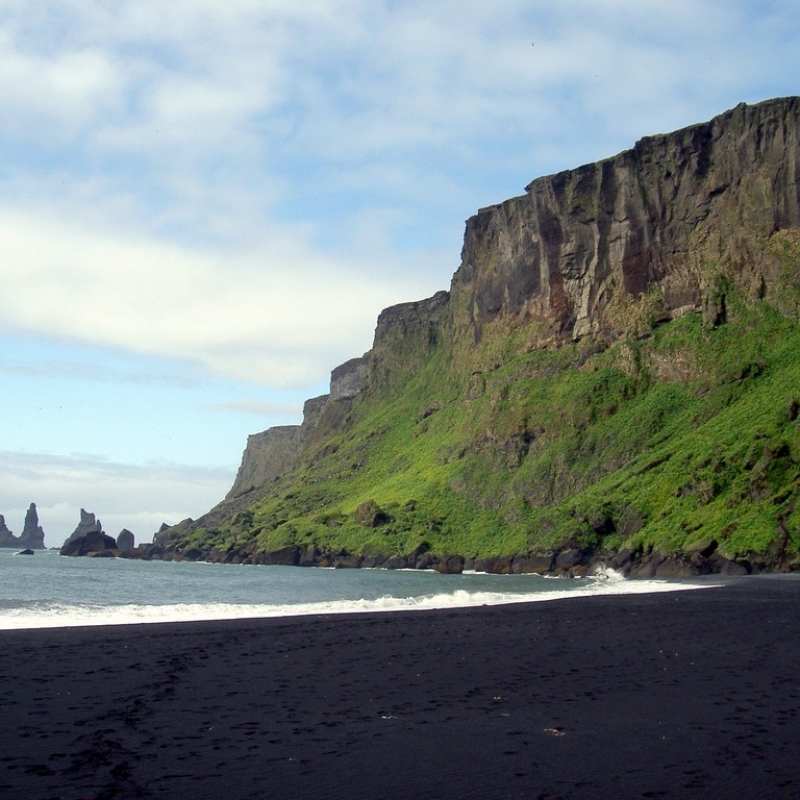 The next stop along the route is Vik village. The local volcanic beach is known throughout the world. Lava flows during a volcanic eruption got to the ocean and froze in amazing column forms. The black sand adds more mystery to the view of the beach.
