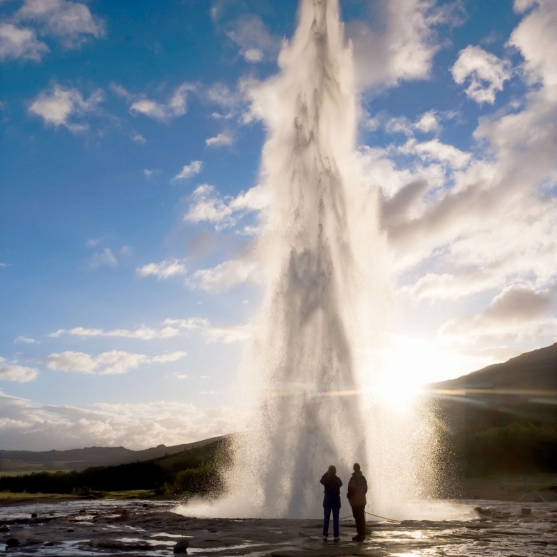 Then we’ll visit the Gullfoss Waterfall, one of the most beautiful in Iceland. The water rushes into the valley down the two steps, and on a clear day you can see a rainbow over them.