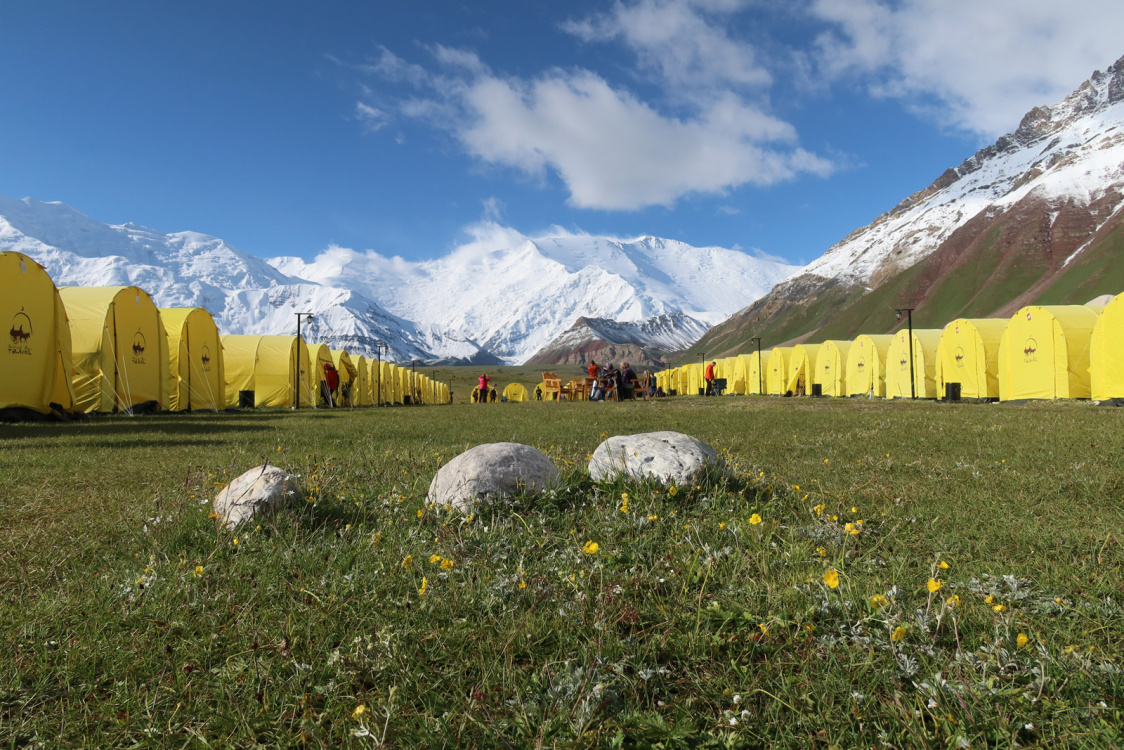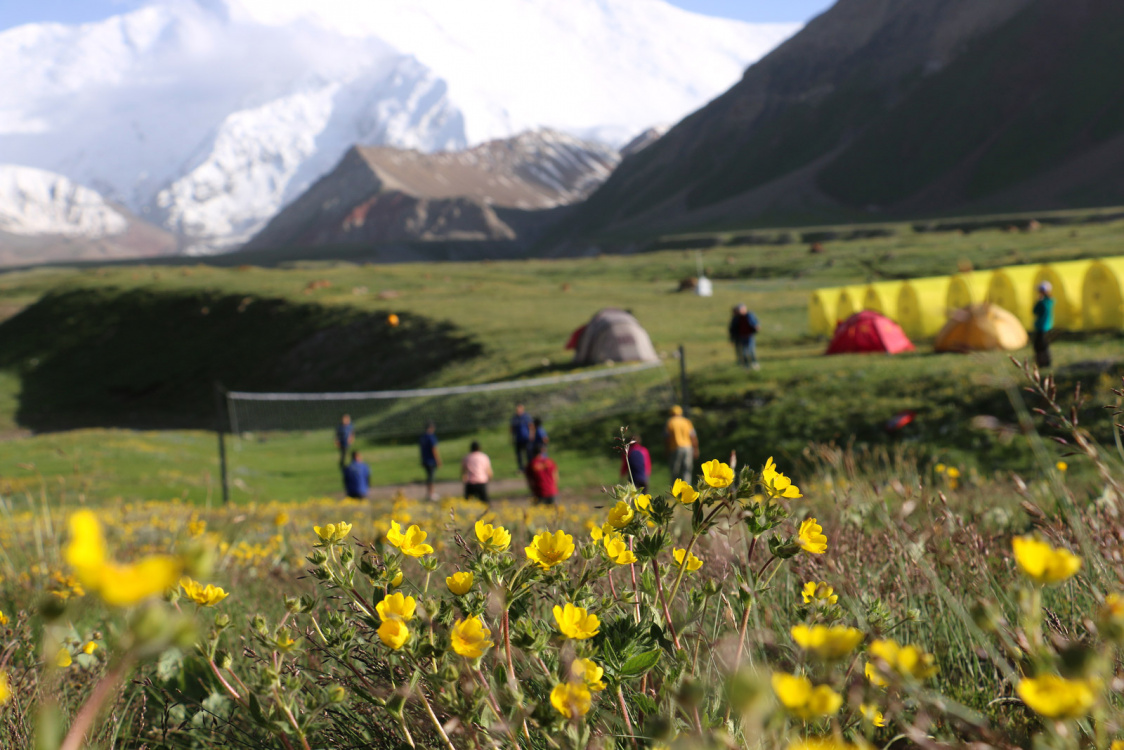 In the morning you will go to the base camp that is situated under Lenin Peak at an altitude of 3,600 m. The journey will take about 3 hours, but the road won’t be boring — you will enjoy impressive views of the Pamirs along the way. The camp with the poetic name Edelweiss Glade is located in a picturesque place among alpine meadows and sparkling glaciers. You will be accommodated in comfortable heated tents, have some rest, and then go for the first walk — to the Lukovaya meadow, which will amaze you with a lot of bright fragrant flowers.