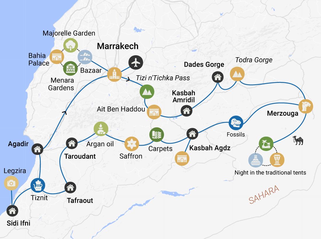 • In the second part you’ll move to the Atlantic coast to explore the local folk crafts, visit Tiznit - the Moroccan capital of silver jewelry, see argan groves and take a walk along the beach.