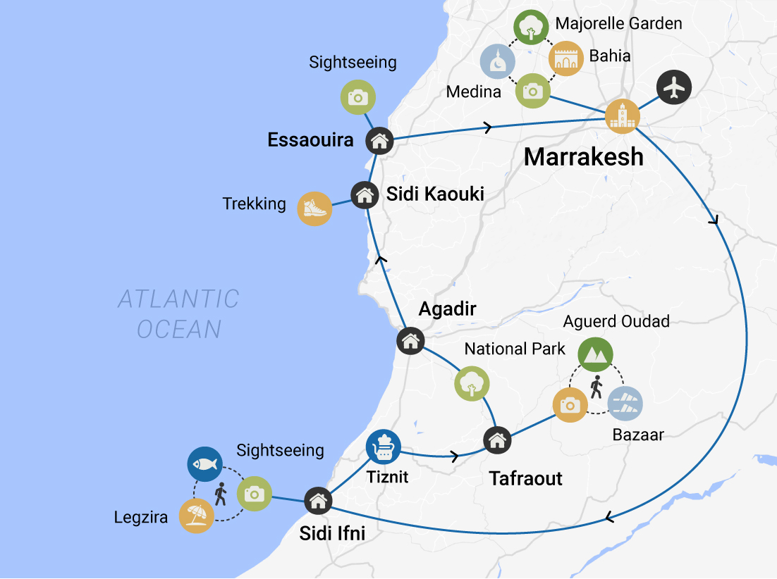 On this day we'll start our journey to the far shores of the Atlantic — we will see the mountain range of the High Atlas and cross its offsets heading south to the Sidi Ifni province. Here, the blue and white buildings, colonial-style waterfront, and an old theater have remained since the Spanish reign. We will stay in a traditional Moroccan house with a courtyard — a riad.