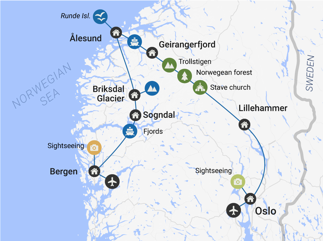 We invite you to explore the most beautiful spots in Norway! We'll visit the very edge of the world and stand on the shores of the Scandinavian Peninsula, feeling the ocean's breath. We will touch a giant glacier that delights with its incredibly blue color. We will experience the thrill of being Vikings: we'll bravely navigate through the huge winding fjords aboard a