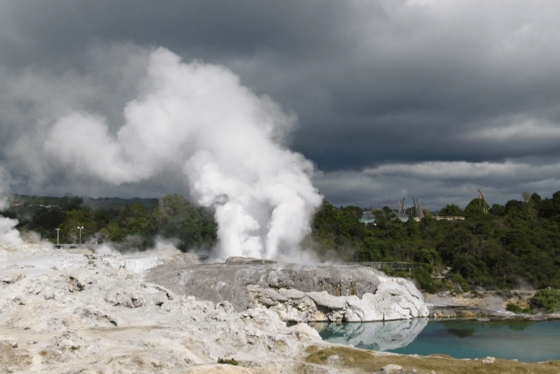 Next, our journey takes us to the shores of Lake Taupo, the largest lake in Oceania. Nearby lies the cascading Huka Falls, where a powerful torrent of water is forced through a narrow rock canyon.