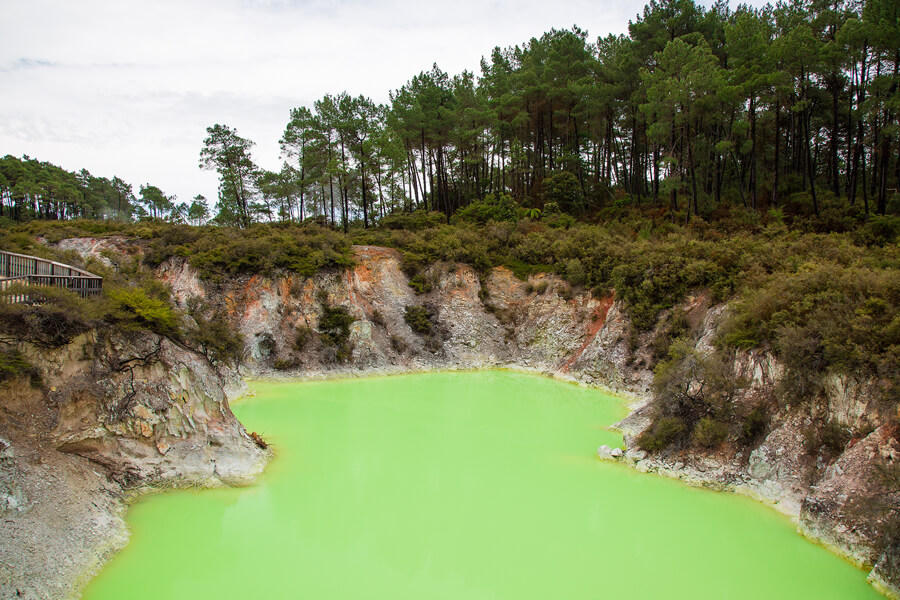 This day is dedicated to exploring the natural wonders surrounding Rotorua. First, we head to the Wai-O-Tapu geothermal park. The area is famous for its surreal shapes and colors, featuring the neon-green Devil’s Bath and the Champagne Pool, which constantly bubbles with escaping gases.