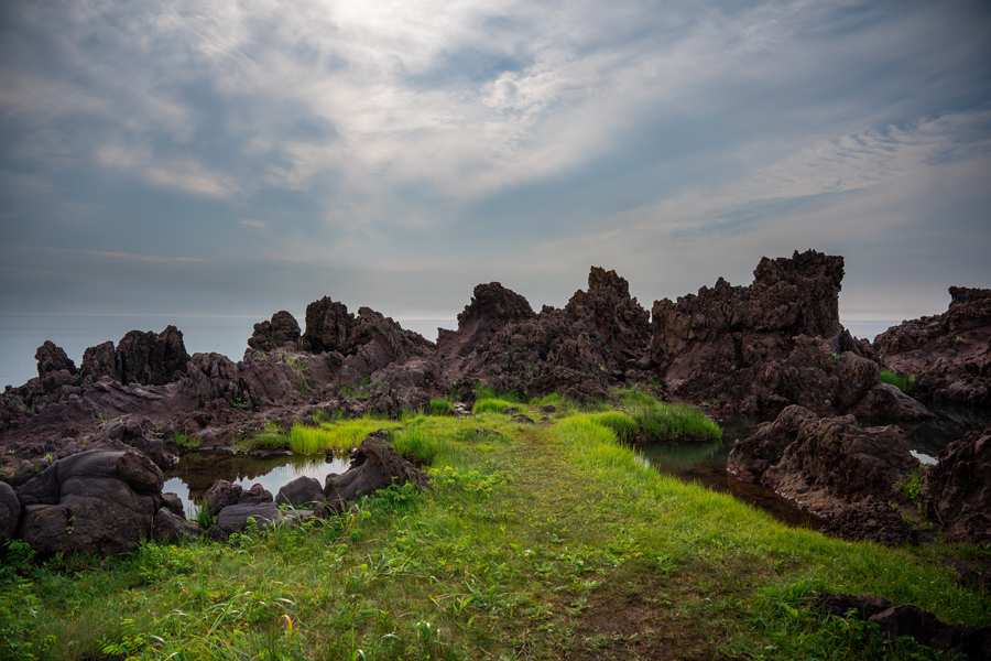 Get ready to find yourself on another planet! The beach of the Kuril Bay is formed of solidified volcanic lava and resembles unusual Martian landscapes. The silhouettes of black rocks in the ocean make them even more mysterious. Surprisingly, you can find green grass and beautiful flowers breaking through the layer of lava.