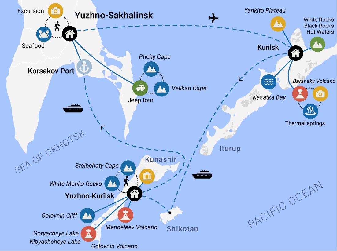 Some of the trips has a reversed route: first you will visit the island of Iturup, and then the island of Kunashir.