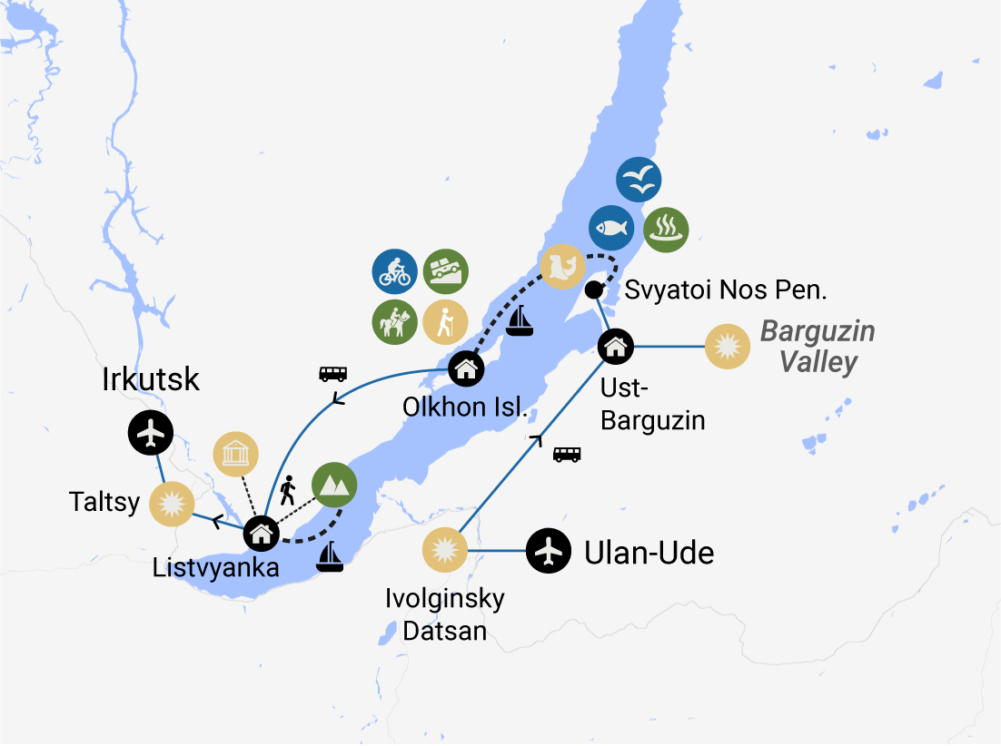 A large team of specialists works on this route. We book the coziest guest houses and keep an eye on the timing to make you enjoy every minute of the travel. We are truly proud of it. To show you the entire Lake Baikal, we will: