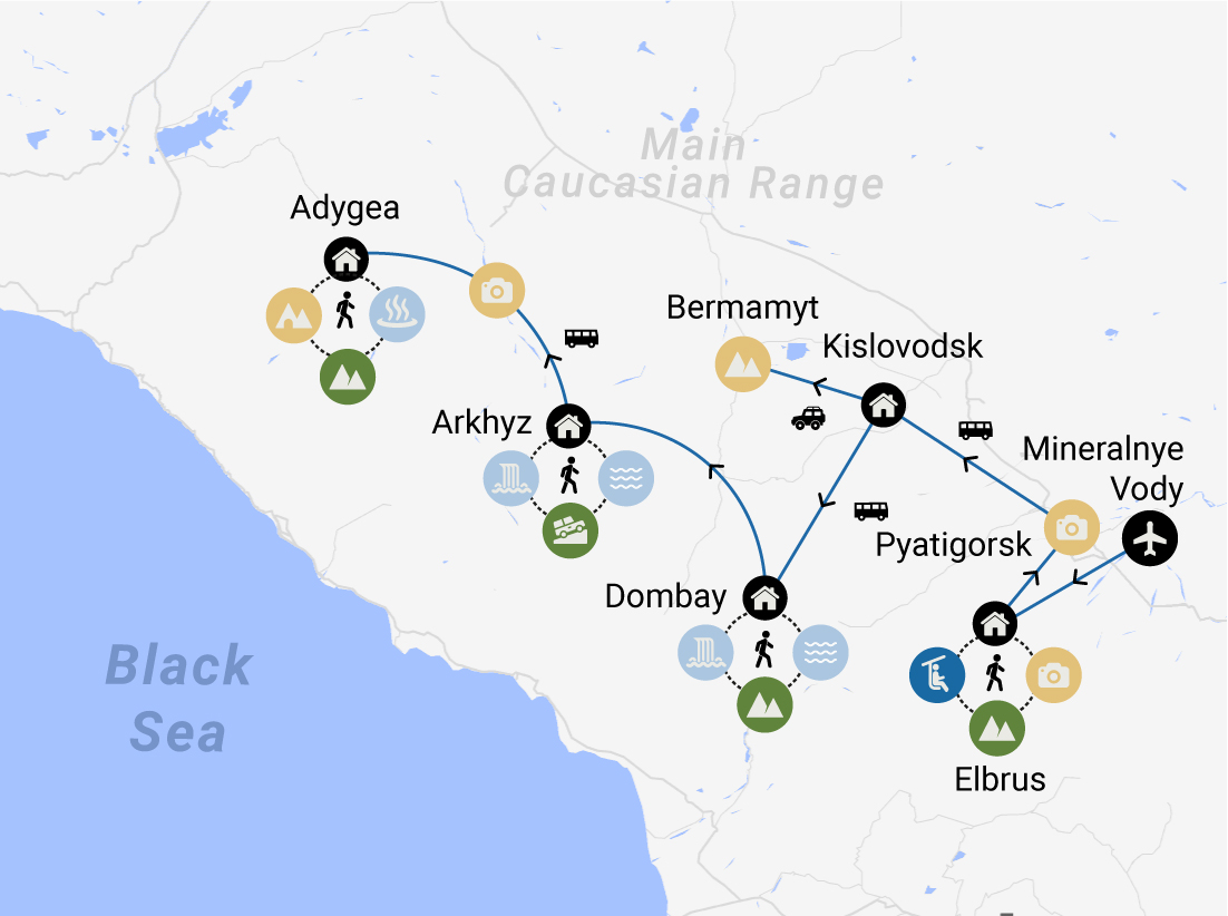 We’ll stay in hotels in double rooms with private facilities: Adygea (1 night) — Arkhyz (1 night) — Dombay (2 nights) — Kislovodsk (1 night) — Prielbrusye (1 nights).