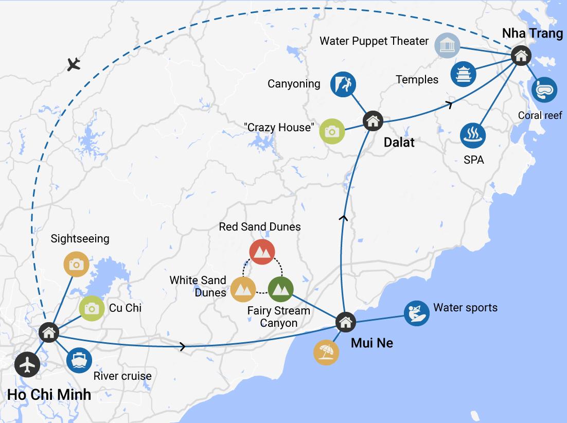 In this trip you will discover the different sides of Vietnam day after day: we’ll walk around beautiful cities, go snorkeling and canyoning, visit the desert and relax on the beach and in the SPA. We’ll also get to know the history of Vietnam and national cuisine — we are sure that some dishes will surprise you!
